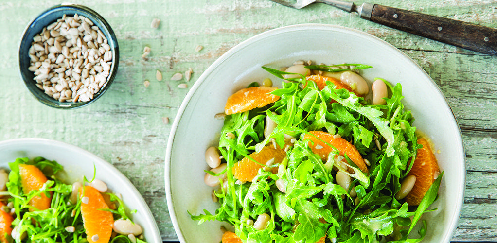 - В большой миске перемешайте рукколу, белую фасоль, апельсины и зелёный лук.