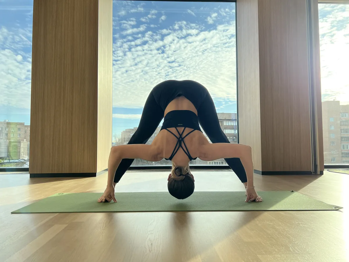 1. Прасарита Падоттанасана (поза интенсивного вытяжения ног). Поставьте ноги на расстояние 2,5-3 ширины таза, стопы параллельны друг другу внешним краем. Большие пальцы рук или ладони положите на крестец или соберите пальцы рук в замок за спиной. На вдохе удлините переднюю часть корпуса, вытягиваясь немного назад. Оставляя вытяжение, сделайте наклон вперёд. При выполнении классического варианта обхватите йоговским хватом большие пальцы ног (указательный и средний пальцы на руках соединяются с большим пальцем ноги, создавая кольцо). Если это сложно, то согните колени или перехватите щиколотки. На выдохе сгибаем локти, подтягивая себя к ногам. Локти разводим в разные стороны. В любых вариантах плечи уводим вверх к тазу, удлиняя шею. Макушка смотрит строго в пол. Коленные чашечки подтянуты. Ногами толкаем коврик в разные стороны, прокручивая тазобедренные суставы и направляя седалищные косточки вверх. Выполняем асану на 5 дыхательных циклов. На вдохе поднимаемся.