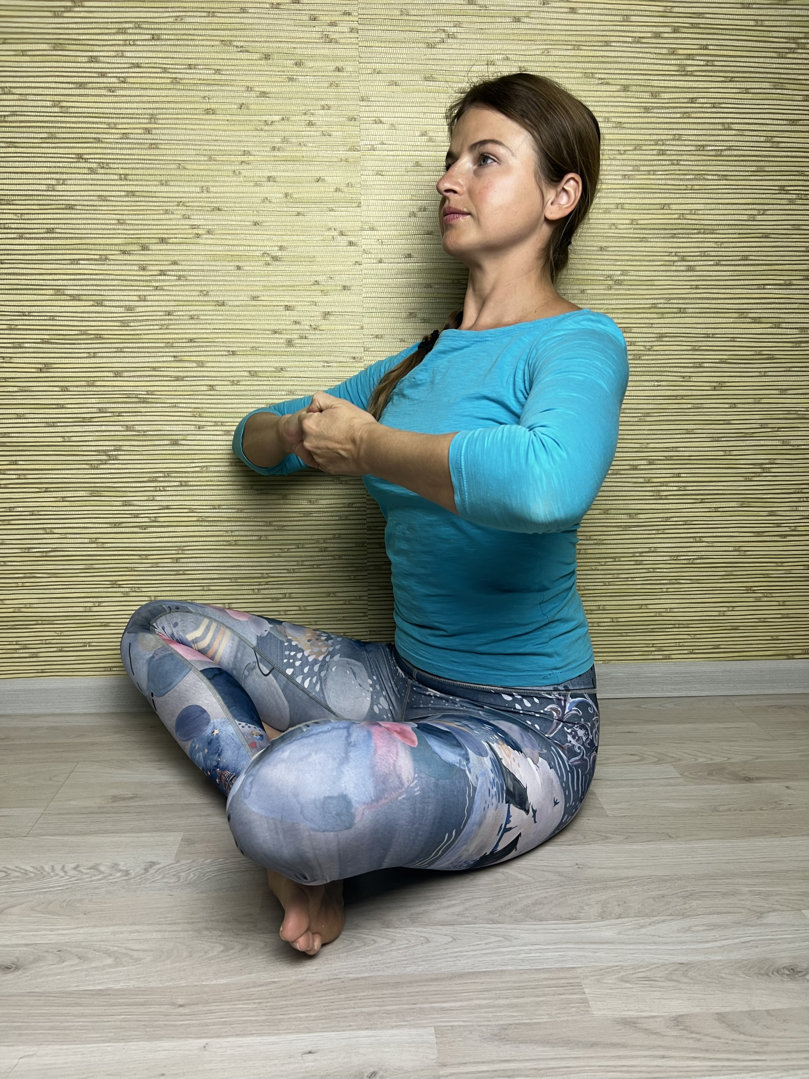 - Вытяжение сидя. Вариантов выполнения может быть много. Сядьте лицом к стене, расположите руки на стену и вытянитесь вверх. Выполните сначала прямыми руками, а затем согните их в локтях, как на фото. Оставайтесь в позе 3 минуты.