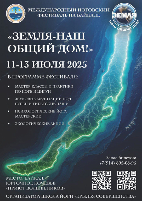 Школа Йоги (МПООО) «Крылья Совершенства», приглашает вас на Международный Фестиваль йоги «Земля-наш общий Дом!», который пройдёт 11-13 июля 2025 года на площадке эко-лагеря «Юрточное Кочевье», оз. Байкал.