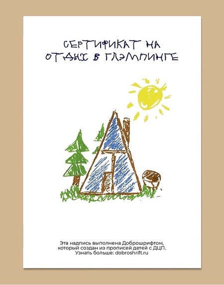 Подарочные сертификаты, часть суммы от продажи которых идёт на помощь детям, оформлены с использованием «Доброшрифта» — рукописного шрифта, созданного детьми с ДЦП.